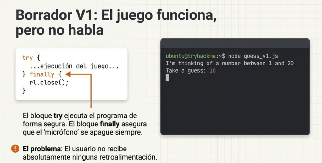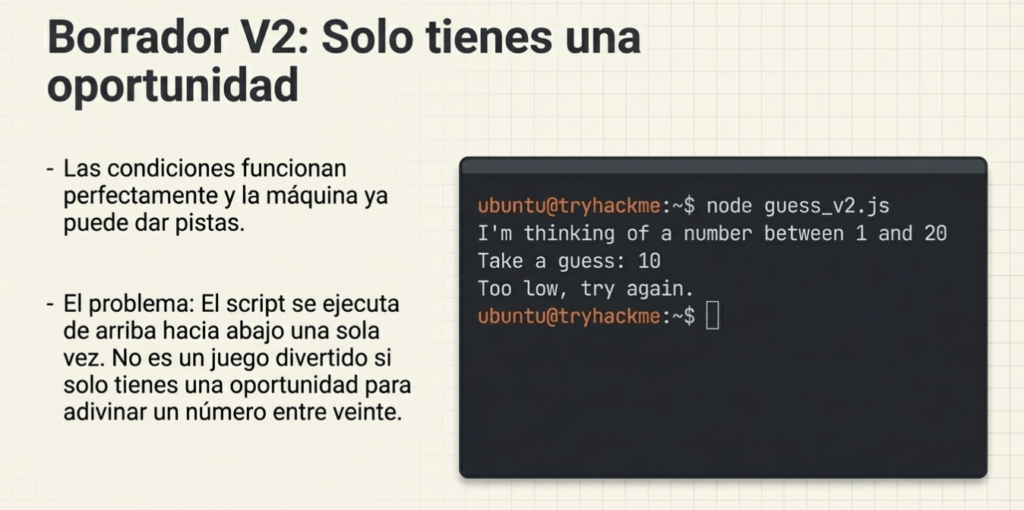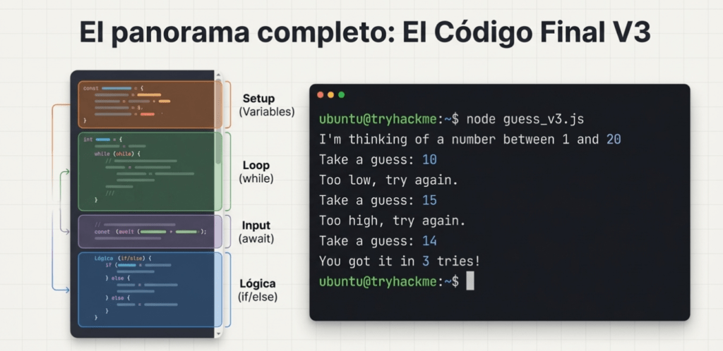 Cabe destacar que el archivo node guess_v4.js, tanto en la máquina virtual como en el zip adjunto a la Tarea 3, mejora aún más este programa. Le recomendamos que lo revise; sin embargo, no es fundamental para esta sala introductoria.