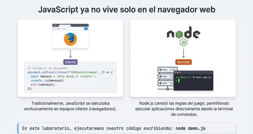 JavaScript se utiliza en la mayoría de las páginas web que visitamos a diario. Por lo tanto, cuando pensamos en motores JavaScript, nos vienen a la mente los navegadores web. De hecho, JavaScript se desarrolló inicialmente para ejecutarse en equipos cliente, en particular, dentro de un navegador web. Sin embargo, esto cambió con el lanzamiento de Node.js, que permite a los desarrolladores crear aplicaciones web con JavaScript. En consecuencia, con la expansión de Node.js, JavaScript dejó de ser solo un lenguaje de programación del lado del cliente para convertirse también en un lenguaje del lado del servidor.
