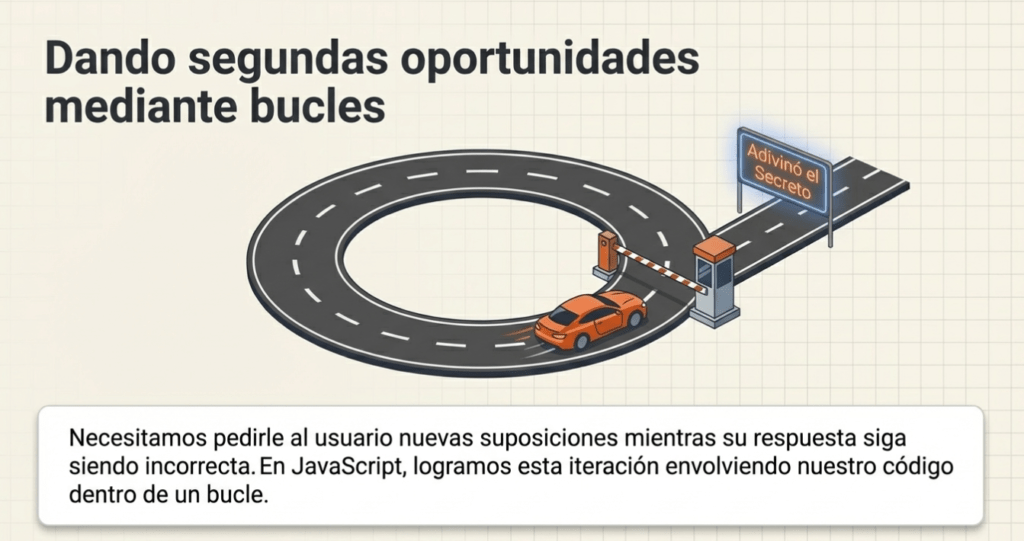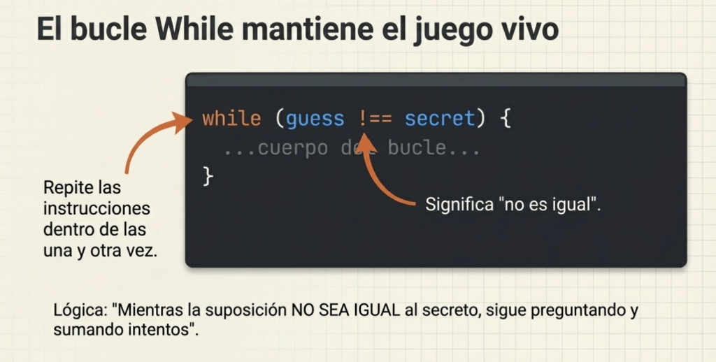 Para mantener el juego activo hasta que se acierte el número correcto, se utiliza un bucle de repetición. Este bucle permite que el programa continúe solicitando intentos mientras la condición principal se mantenga. En este caso, la condición se basa en que la suposición del usuario sea diferente al número secreto, lo que suele evaluarse con operadores lógicos como !==, que verifica si dos valores no son iguales.