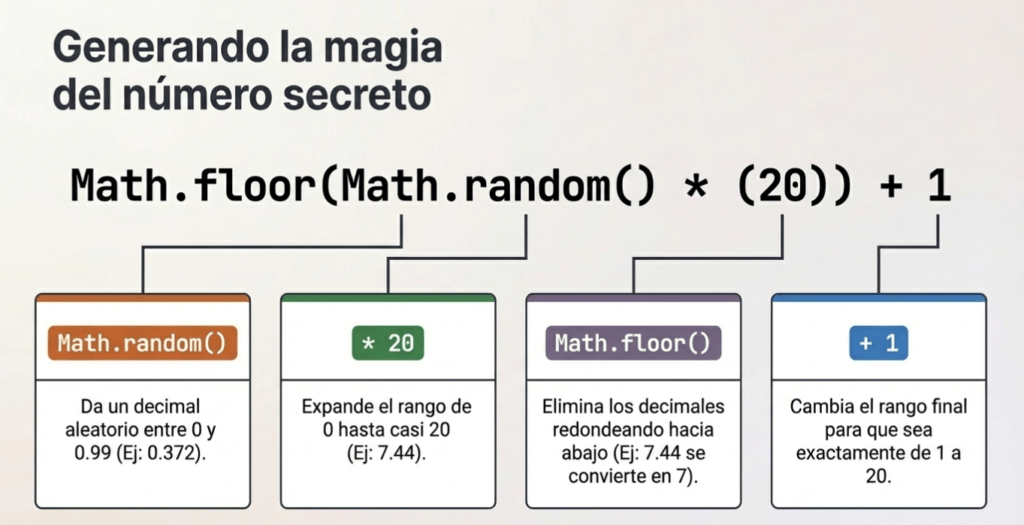 Para generar el número secreto se utiliza una función aleatoria. Mediante Math.random() combinado con Math.floor() es posible crear un número entero dentro de un rango específico, como entre 1 y 20. Este valor se convierte en el objetivo del juego, y el usuario deberá descubrirlo mediante prueba y error.