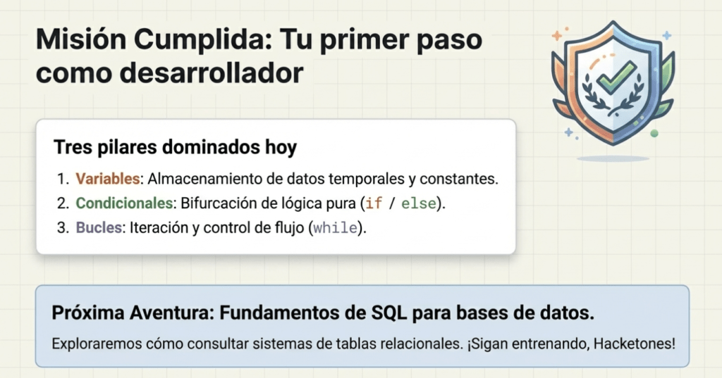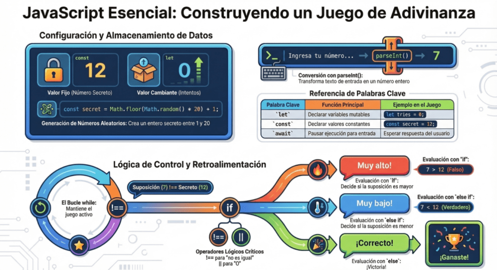 Este pequeño proyecto combina varias piezas esenciales de JavaScript: declaración de variables, generación de números aleatorios, conversión de tipos de datos, estructuras condicionales y bucles de repetición. Aunque el resultado final es un juego sencillo, el proceso de construcción permite entender cómo se conectan los elementos básicos del lenguaje para crear lógica interactiva.