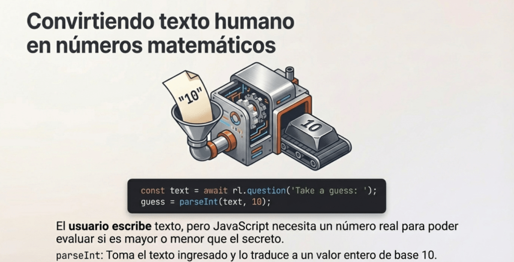 Cuando el jugador introduce su respuesta, el programa recibe esa información normalmente como texto. Para poder compararla con el número secreto es necesario convertirla en un número entero. Aquí entra en juego parseInt(), una función que transforma la entrada de texto en un valor numérico que el programa puede evaluar correctamente.