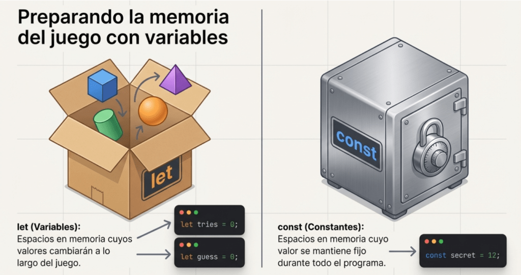 Todo comienza con la configuración y almacenamiento de los datos. En JavaScript, las variables permiten guardar información que el programa necesita utilizar durante su ejecución. Por ejemplo, el número secreto puede declararse como una constante usando const, ya que su valor no cambia una vez generado. En cambio, el número de intentos o la suposición del jugador pueden almacenarse en variables declaradas con let, que sí permiten modificaciones durante el flujo del programa.