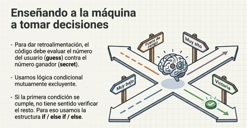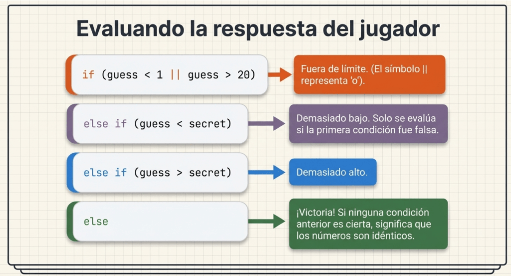 | Estructura de Control Condicional | if / else if / else | Estructuras que permiten ejecutar diferentes bloques de código según se cumplan o no ciertas condiciones. | Evalúa si ‘guess’ está fuera de rango, es menor, mayor o igual a ‘secret’. | Condicional |