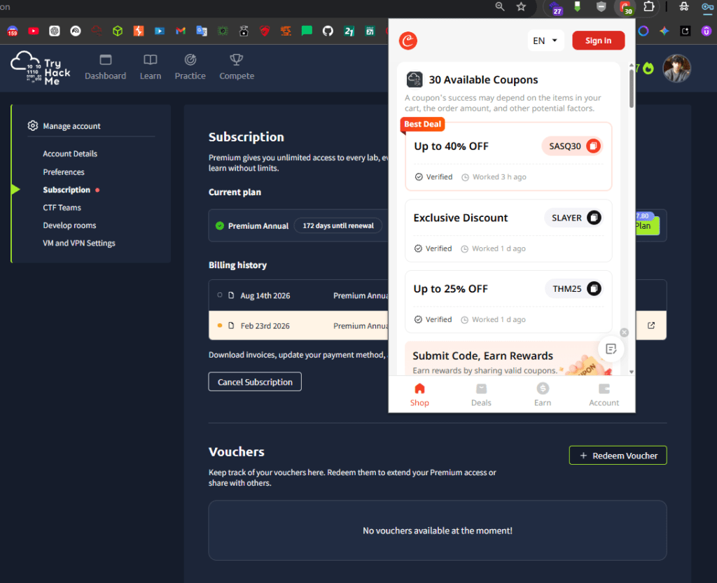 Nota: No tengo relación con THM ni HTB. Alguna de estas máquinas son gratis otra de pago. Si quieren pasarse a la versión de pago les recomiendo ver si hay cupones de descuento, les puede salir hasta un 50% menos. El plugin de coupert anda bastante bien…