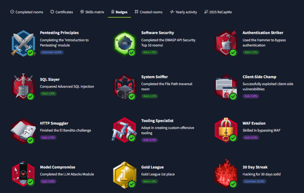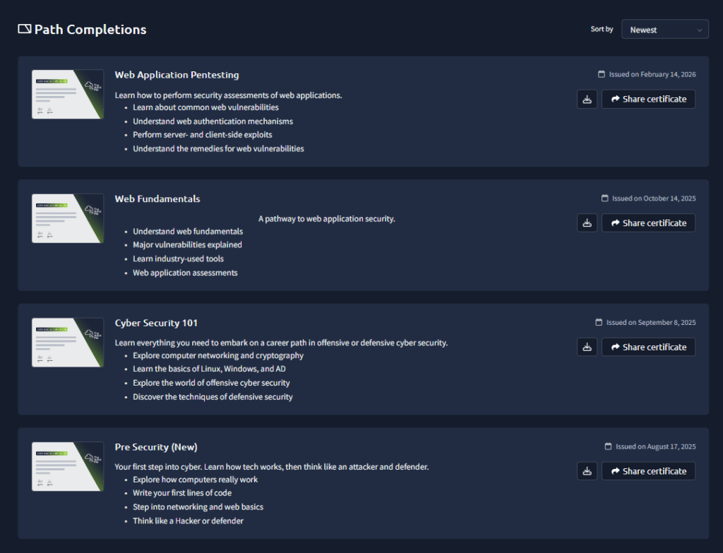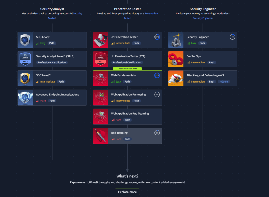 Ir resolviendo las diferentes Rooms nos otorgará puntos e insignias conforme lo hayamos logrado, estos puntos nos servirán para mejorar nuestra clasificación en el ranking e ir elaborando un perfil que poco a poco indica que somos hackers más experimentados. También existen los Paths, que básicamente son un conjunto de Rooms agrupadas en base a adquirir conocimientos para un objetivo. (Por ejemplo, las certificaciones Comptia Pentest+ o el OSCP).