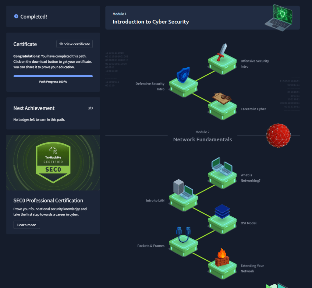 Hola hacketones! En este capítulo: TryHackMe Pre Security certificación SEC0 Indexo la ruta completa de TODAS las salas para alcanzar esta certificación.
