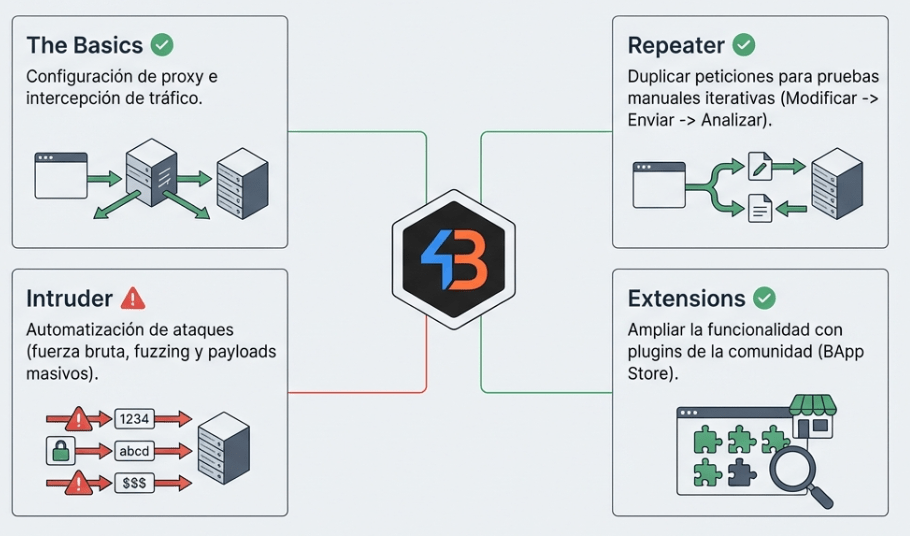 Burp Suite es la Herramienta Estándar: Esencial para cualquier prueba de penetración web. Actúa como un «Man-in-the-MiddIe» para interceptar y modificar todo el tráfico entre tu navegador y el servidor.