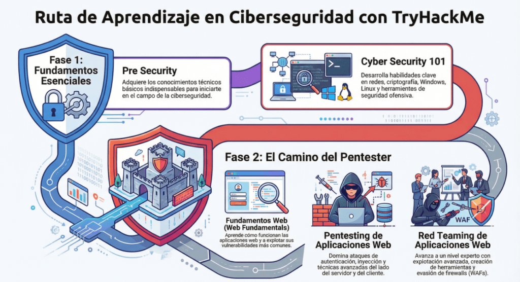 No puedes romper lo que no entiendes. Una de las revelaciones más crudas para cualquier aspirante a pentester es que el hacking no comienza lanzando exploits sofisticados, sino dominando los fundamentos. La ruta «Pre-Security» es el cimiento indispensable. Diseñada como una forma divertida y fácil de aprender, esta ruta reemplaza a la antigua «Complete Beginner» y se enfoca en los pilares: Linux, Windows, Redes y Fundamentos de informática.