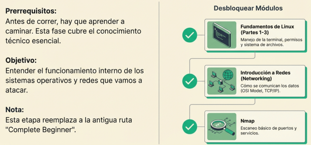 Dominar cómo viaja un paquete de datos o cómo se gestionan los permisos en un sistema operativo es lo que te separa de ser un simple script kiddie. «Para atacar o defender cualquier tecnología, primero debes aprender cómo funciona». Antes de intentar vulnerar un servidor, debes entender su arquitectura. Esta ruta garantiza que, cuando llegues a las herramientas avanzadas, comprendas exactamente qué está sucediendo «bajo el capó».