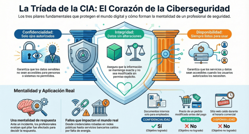 En el mundo real, las fallas en cualquiera de estos tres principios pueden tener consecuencias significativas. Documentos internos filtrados representan un problema de confidencialidad, la alteración de información crítica afecta la integridad, y un servicio digital caído durante horas impacta directamente la disponibilidad. Por esta razón, la tríada CIA sigue siendo uno de los conceptos más importantes para entender cómo se protege la información en la era digital.
