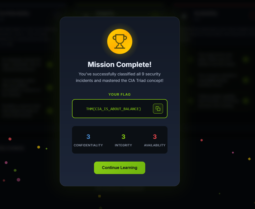 ¡Bien hecho!  Esta sala marca tu primer paso en la ciberseguridad. Has aprendido algo muy importante: ¿Qué protegemos exactamente en ciberseguridad? Al comprender la Tríada de la CIA , adquirirá el conocimiento de una mentalidad central de seguridad cibernética, que es la base de muchos conceptos de seguridad cibernética que encontrará a medida que continúa su viaje en este campo.