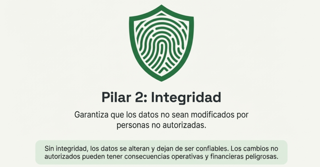 La integridad se refiere a la garantía de que los datos permanecen correctos y sin alteraciones no autorizadas. Cuando la integridad se ve comprometida, la información puede ser modificada de forma maliciosa o accidental, lo que puede generar consecuencias graves. Un ejemplo claro sería la manipulación del precio de un producto en una tienda en línea antes de finalizar una compra. Para proteger este pilar se utilizan controles como firmas digitales, hashing, registros de auditoría y sistemas de verificación de cambios.