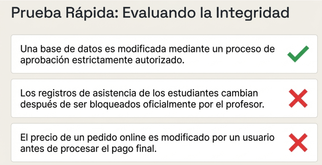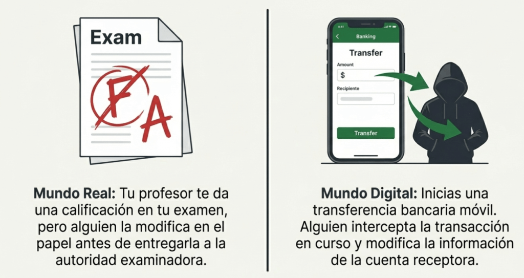 Imagina que tu profesor te da una buena calificación en tu examen y que alguien la modifica antes de enviarla a la autoridad examinadora. Esto vulnera la integridad de la calificación de tu examen. Para garantizar la integridad en el futuro, tu profesor podría empezar a anotar las calificaciones en una hoja aparte y verificarlas antes de la entrega final a la autoridad examinadora.