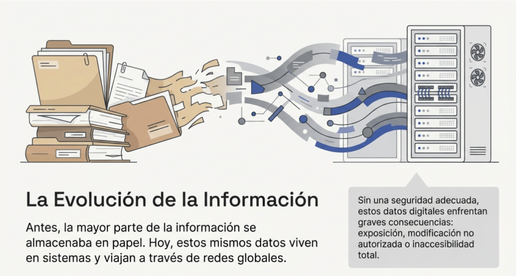 Antes, la mayor parte de la información se almacenaba en papel. Hoy en día, esta misma información se almacena como datos digitales en sistemas y se comunica a través de las redes. Sin una seguridad adecuada, estos datos digitales pueden sufrir graves consecuencias. Pueden quedar expuestos a personas indebidas, modificarse sin permiso o no estar disponibles cuando más se necesitan. Por lo tanto, proteger estos datos digitales se ha convertido en un requisito fundamental para gobiernos, organizaciones y particulares.