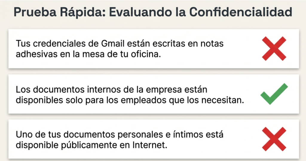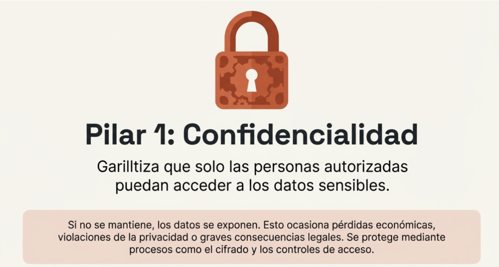 La confidencialidad se enfoca en asegurar que la información solo pueda ser vista por personas o sistemas autorizados. Esto significa proteger datos sensibles contra accesos indebidos, filtraciones o espionaje digital. En la práctica, se implementa mediante mecanismos como autenticación, control de acceso, cifrado de datos y gestión de identidades. El objetivo es que únicamente quienes tienen permiso puedan acceder a determinada información.