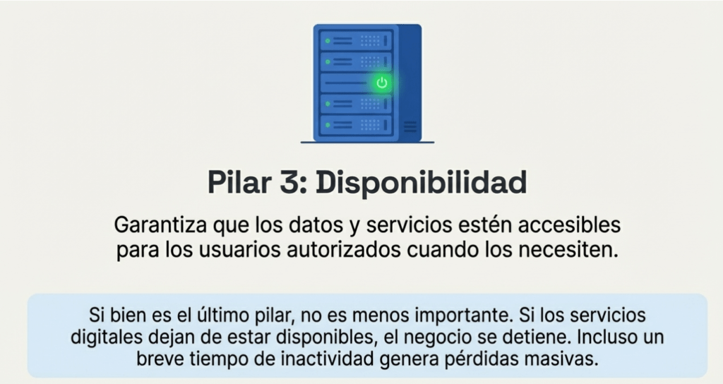 El tercer pilar es la disponibilidad, que asegura que los sistemas, servicios y datos estén accesibles cuando los usuarios autorizados los necesiten. No basta con que la información esté protegida; también debe poder utilizarse en el momento adecuado. Ataques como los de denegación de servicio, fallos de infraestructura o interrupciones eléctricas pueden afectar directamente este principio. Por ello, se aplican estrategias como redundancia de servidores, copias de seguridad, balanceo de carga y planes de recuperación ante desastres.