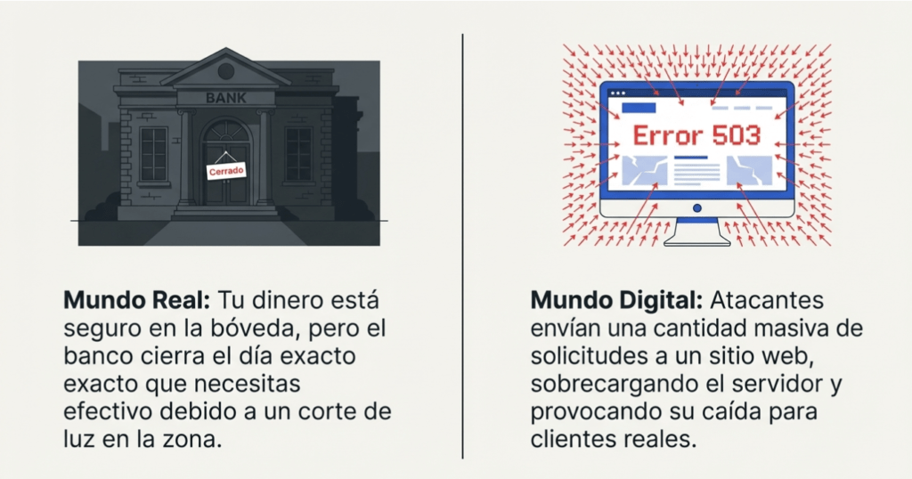 Imagina que depositas tu dinero en un banco que lo mantiene muy seguro, pero el banco cierra el día que lo necesitas debido a un corte de luz. Ahora bien, aunque tu dinero esté en un lugar seguro, si tú, como propietario, no puedes acceder a él, es inútil. Aquí es donde la disponibilidad importa. Por lo tanto, para garantizar la disponibilidad en tal caso, tu banco probablemente instalaría un generador eléctrico alternativo para mantener los servicios en funcionamiento incluso si falla la red eléctrica principal.