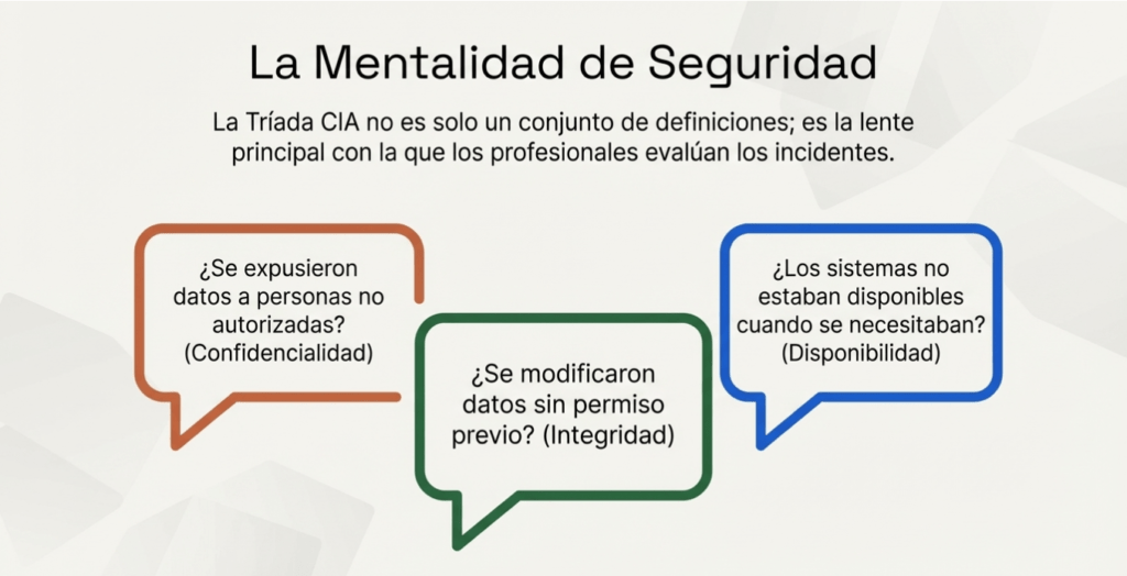 Comprender esta tríada no solo implica conocer sus definiciones, sino también desarrollar una mentalidad de análisis ante incidentes de seguridad. Cuando ocurre un problema en un sistema, los profesionales de seguridad suelen preguntarse primero cuál de estos pilares ha sido afectado. Esta forma de pensar permite evaluar el impacto real del incidente y diseñar una respuesta adecuada.