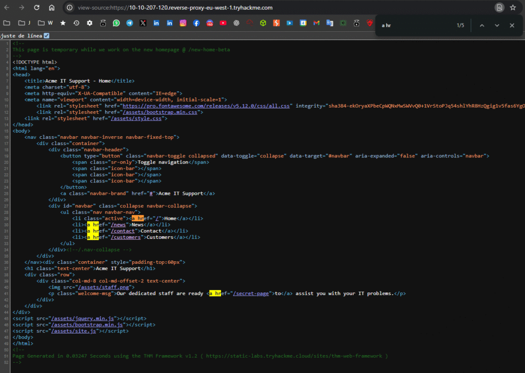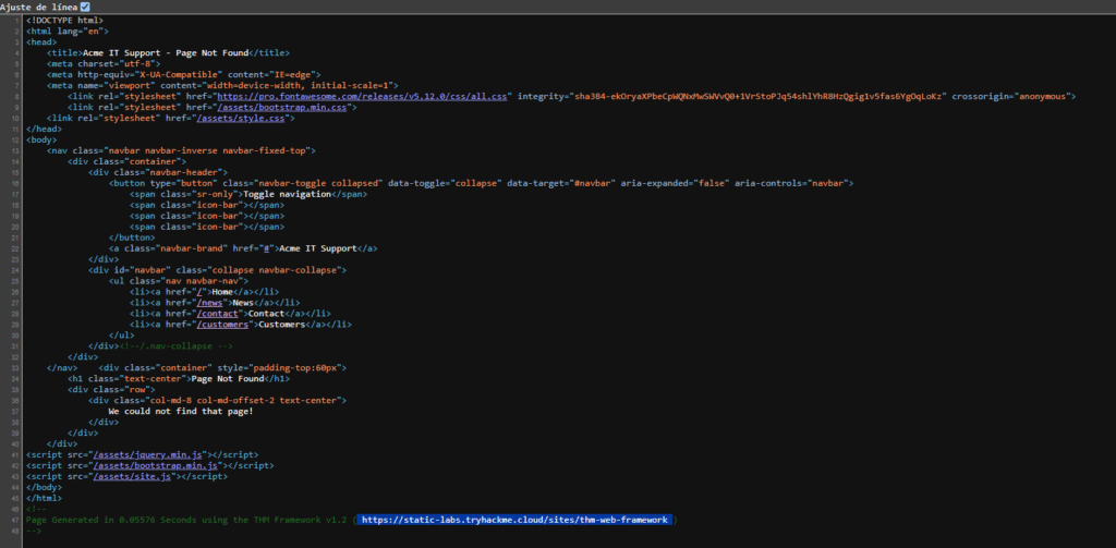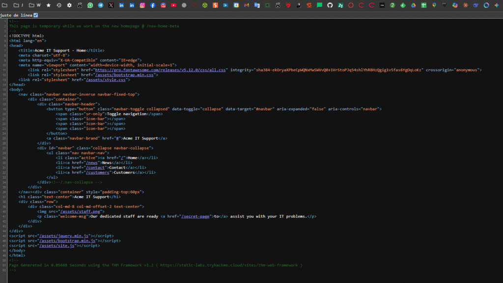 Intente ver el código fuente de la página de inicio del sitio web de Soporte Técnico de Acme. Lamentablemente, explicar todo lo que ve aquí está fuera del alcance de esta sala, y necesitará consultar cursos de diseño y desarrollo web para comprenderlo completamente. Lo que podemos hacer es seleccionar información importante para nosotros.