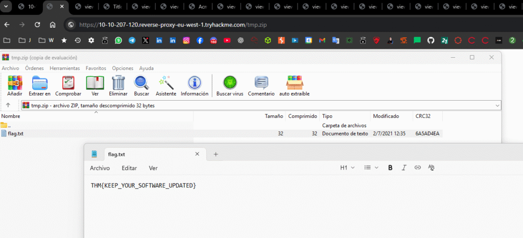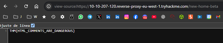 - Comentarios HTML (<!– … –>) con pistas internas → Flag: THM{HTML_COMMENTS_ARE_DANGEROUS}.