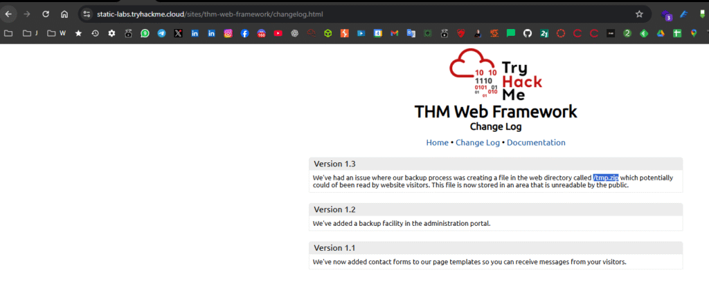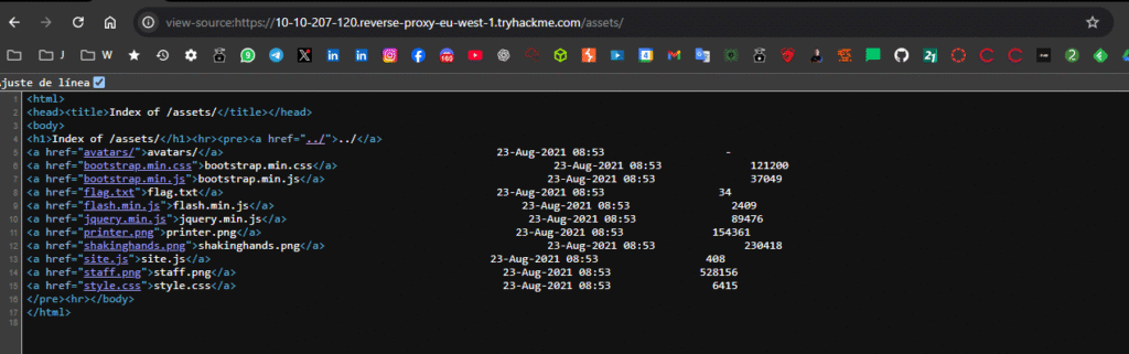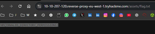 - Recursos estáticos (CSS/JS/img) y listado de directorios mal configurado → Flag: THM{INVALID_DIRECTORY_PERMISSIONS}.