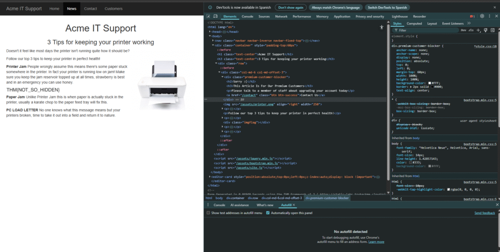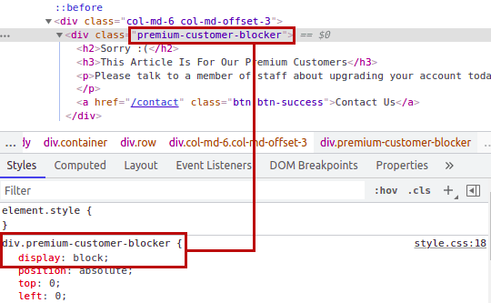 Localiza el elemento DIV con la clase premium-customer-blockery haz clic en él. Verás todos los estilos CSS en el cuadro de estilos que se aplican a este elemento, como margin-top: 60pxy text-align: center. El estilo que nos interesa es el display: block. Si haces clic en la palabra block, puedes escribir un valor a tu elección. Intenta escribir none; esto hará que el cuadro desaparezca, revelando el contenido debajo y una bandera. Si el elemento no tenía un campo de visualización, puedes hacer clic debajo del último estilo y añadir el tuyo. Experimenta con el inspector de elementos y verás que puedes cambiar cualquier información del sitio web, incluido el contenido. Recuerda que esto solo se edita en la ventana de tu navegador y, al pulsar «Actualizar», todo volverá a la normalidad.