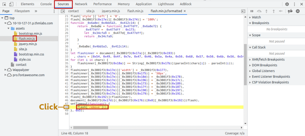 Podemos recuperar algunos de los formatos usando la opción «Pretty Print», que se presenta como dos llaves { } para facilitar la lectura, aunque debido a la ofuscación, sigue siendo difícil comprender qué sucede con el archivo. Si se desplaza hasta el final del archivo flash.min.js, verá la línea:flash[‘remove’]();