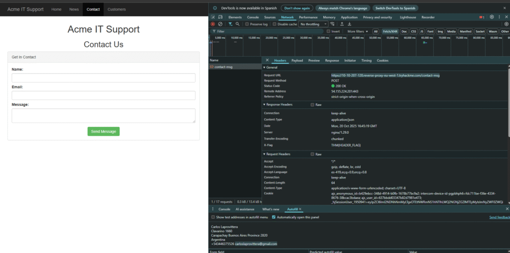 Examine la nueva entrada en la pestaña de red que creó el formulario de contacto y vea la página a la que se enviaron los datos para revelar una bandera.