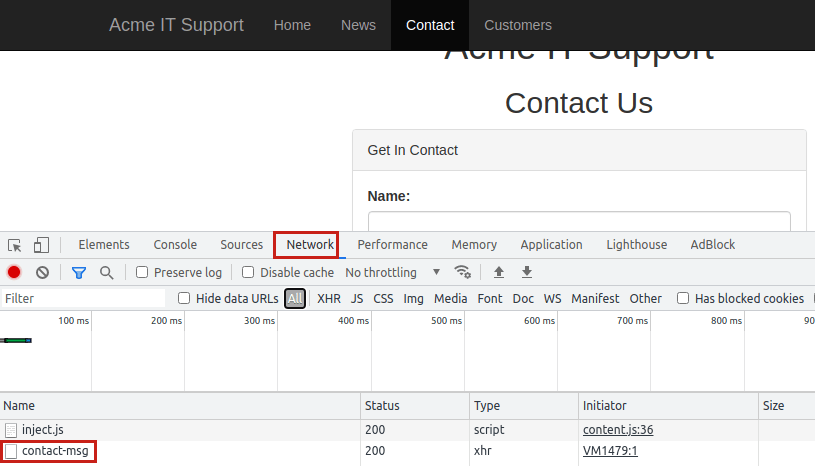 Con la pestaña de red abierta, intenta rellenar el formulario de contacto y pulsar el botón «Enviar mensaje» . Verás un evento en la pestaña de red: el formulario se envía en segundo plano mediante AJAX. AJAX permite enviar y recibir datos de red en segundo plano en una aplicación web sin modificar la página web actual.