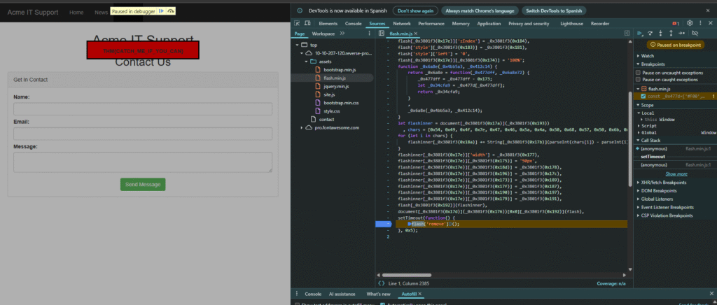 En el sitio web de soporte técnico de Acme, haga clic en la página de contacto. Cada vez que se cargue, podría ver un destello rápido de luz roja en la pantalla. Usaremos el depurador para averiguar qué es este destello rojo y si contiene algo interesante. Depurar un punto rojo no sería algo que harías en la práctica como experto en pruebas de penetración, pero nos permite usar esta función y familiarizarnos con el depurador.