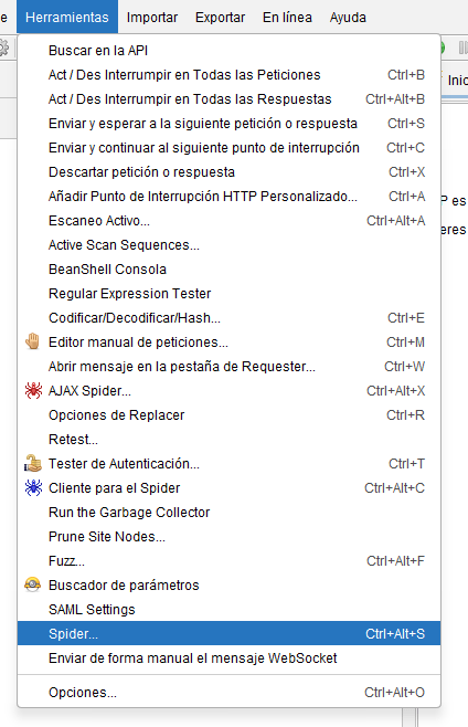 - CTRL + ALT + X o menú Herramientas > AJAX Spider.