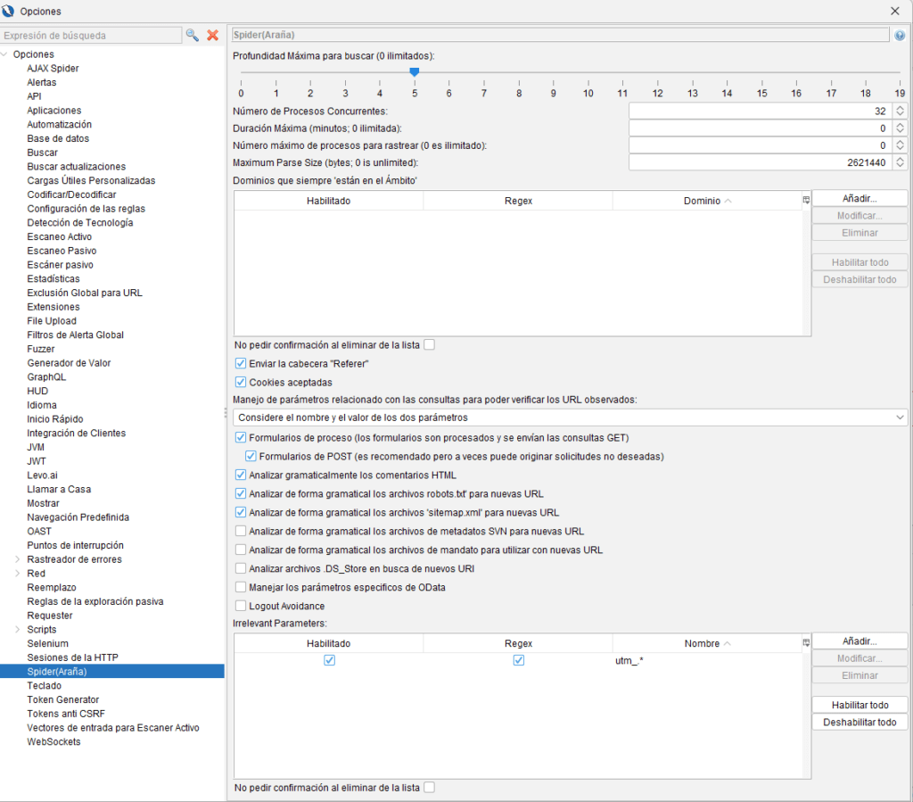 - Al comprobar si una URL ya se ha visitado, el comportamiento con respecto a cómo se manejan los parámetros se puede configurar en la pantalla Opciones de Spider.