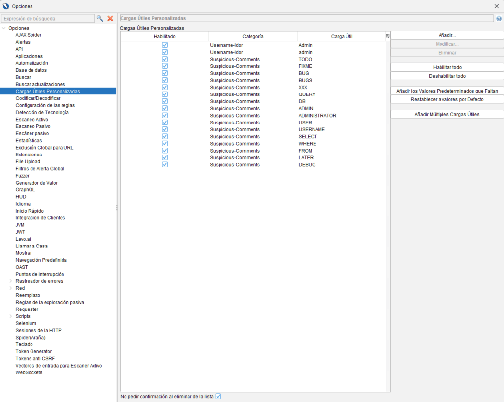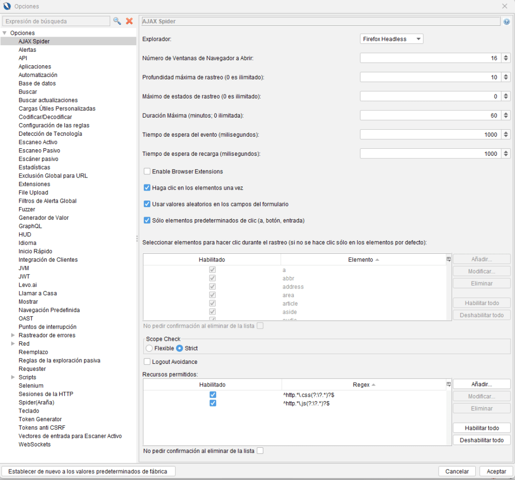 - Ir a Opciones > AJAX Spider > Elementos excluidos.