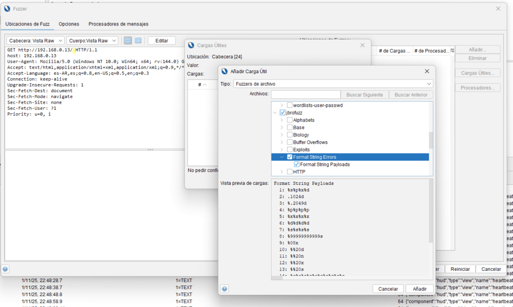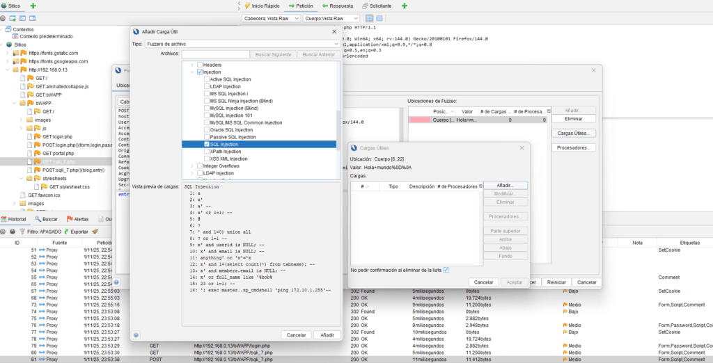 4. Añadir Payloads: En el diálogo de ‘Cargas útiles’, seleccionamos un archivo de la categoría de Inyección SQL o añadimos manualmente payloads conocidos (ej: ´’, ´»», ‘ OR 1=1–´)