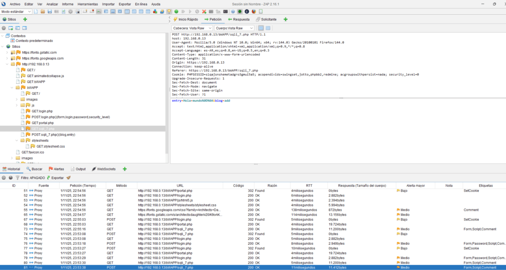 1. Seleccionar la Petición: En el historial de ZAP, localizamos la petición POST del formulario.