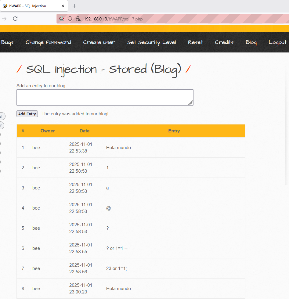 Hemos descubierto un formulario (mediante un Spider) que envía datos a través de un parámetro ENTRY usando el método POST. ¿Qué sucede si en lugar de datos normales, enviamos caracteres especiales y fragmentos de consultas SQL a través del parámetro entry ?