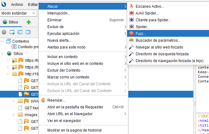 - Menú Sitios → clic derecho sobre una URL → Ataque > Navegación forzada del sitio
