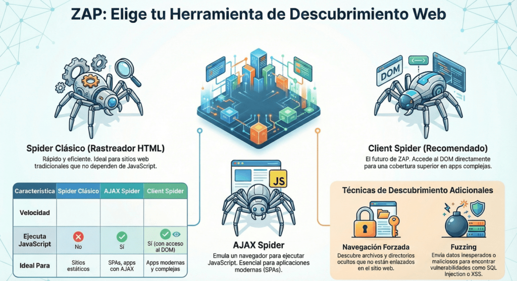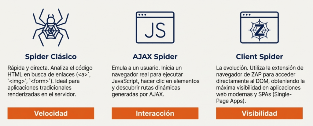 posibles puntos de entrada. ZAP ofrece un arsenal de herramientas de rastreo, conocidas como «arañas» (Spiders), diseñadas para automatizar este proceso de descubrimiento. Cada araña tiene una especialidad. La clave del éxito es