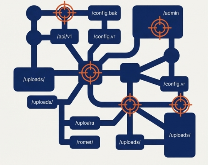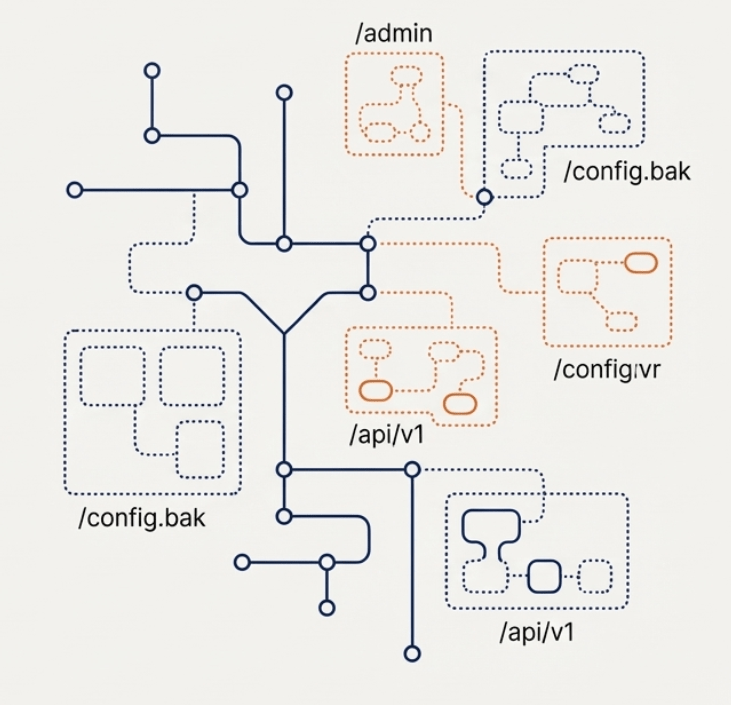 Las arañas encontraron las rutas visibles, pero… ¿qué hay de las puertas que no tienen un camino que lleve a ellas? Las arañas son excelentes para seguir rutas conocidas, pero muchos recursos críticos no están enlazados públicamente. Ejemplos comunes incluyen: paneles de administración, archivos de backup C .bak’), endpoints de API antiguos, archivos de configuración expuestos o directorios de recursos C /uploads/’). Para encontrar estos ‘secretos’, no podemos seguir