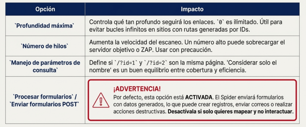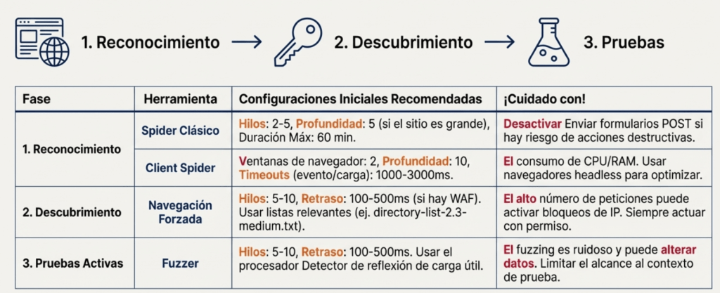 Combina estas herramientas para una cobertura exhaustiva. Empieza amplio con los Spiders, profundiza con la Navegación Forzada y ataca con precisión usando el Fuzzer sobre los descubrimientos más prometedores.