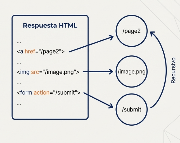 • Solicita cada página y analiza la respuesta HTML en busca de hipervínculos en etiquetas y atributos como:
