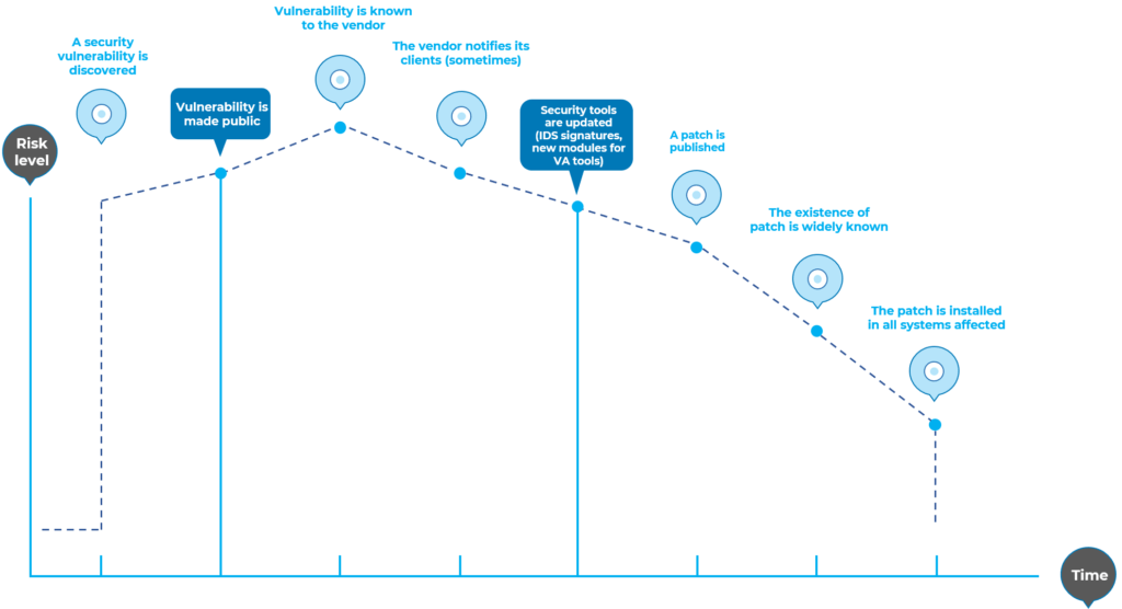 Esta imagen ilustra el ciclo de vida de una vulnerabilidad de seguridad, mostrando cómo evoluciona el nivel de riesgo a lo largo del tiempo desde su descubrimiento hasta que se aplica el parche en todos los sistemas afectados.