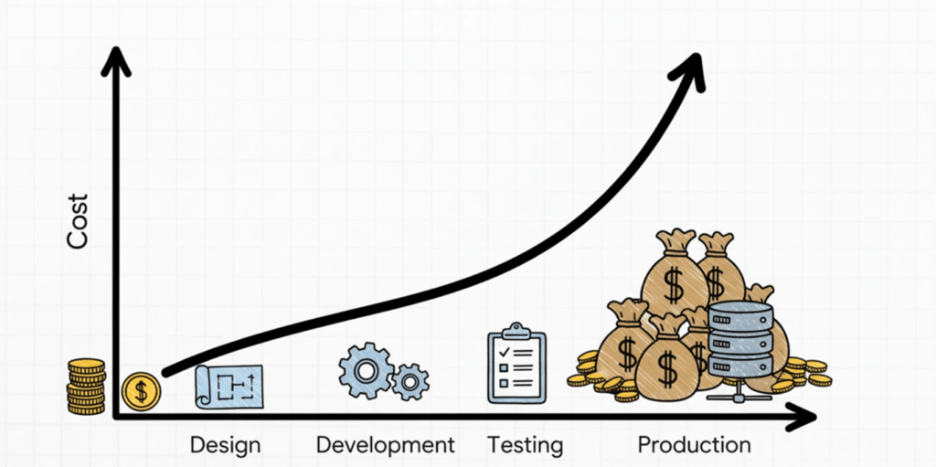 La flecha exterior indica que los costos de corregir errores de seguridad aumentan con cada etapa, reforzando la importancia del enfoque “Shift Left”: integrar la seguridad desde el inicio del ciclo de desarrollo, no al final.