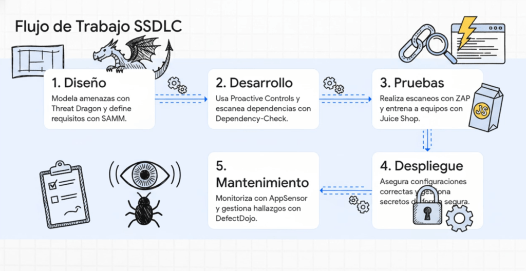 Uno de los aspectos más sólidos de esta guía es que es agnóstica al entorno. Podés aplicarla en una startup que deploya 20 veces por día o en una fintech regulada por PCI-DSS. Te da principios, no recetas cerradas. Por eso, está organizada de forma que puedas usarla como framework de auditoría, como check de aseguramiento de calidad, como guía para DevSecOps, o como plan de ataque completo. Las fases van desde la planificación hasta el mantenimiento, pasando por requisitos, diseño, desarrollo, despliegue y validación. En cada punto te dice qué buscar, por qué, con qué herramientas y cómo medir si algo es aceptable o no.