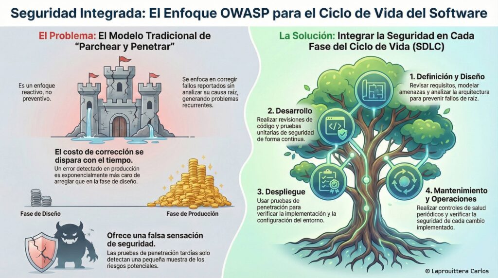 Vemos en esta imagen representa el ciclo de vida del desarrollo de software (SDLC), destacando cómo los costos de corregir errores de seguridad aumentan a medida que el proyecto avanza por sus diferentes etapas.